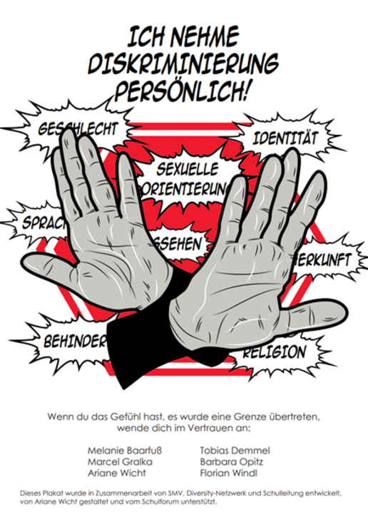 Dieses Plakat wurde in Zusammenarbeit von SMV, Diversity-Netzwerk und Schulleitung entwickelt, von unserer Kunstlehrkraft Ariane Wicht gestaltet und vom Schulforum unterstützt.