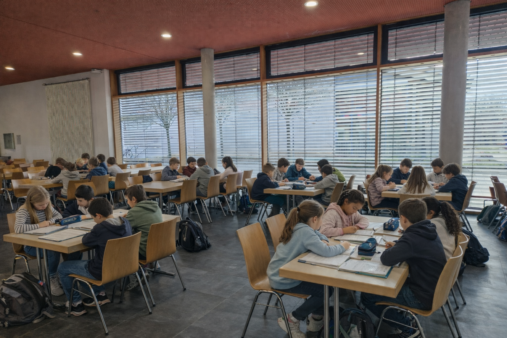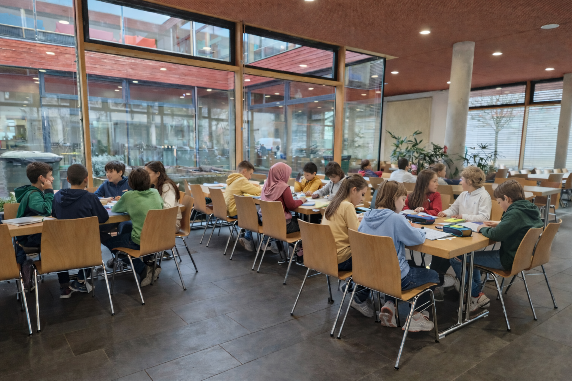 - In der Jahrgangsstufe 6 findet zudem eine klassenübergreifende Öffnung der Studierzeiten am Nachmittag statt, in der die Schüler*innen eigenständig die Art der Bearbeitung ihrer Aufgaben wählen können.